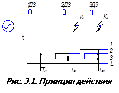 В сетях сложной конфигурации (многоугольники, кольцевые ЛЭП) с несколькими источниками питания, рассмотренные выше максимальные токовые направленные защиты не могут обеспечить селективного быстрого отключения КЗ. Поэтому в сетях напряжением 35 кВ и более, имеющих сложные схемы, применяется более совершенная дистанционная защита. Реле защиты реагирует на отношение подведенных к нему Up и Iр, отношение которых оказывается пропорциональным расстоянию от места установки защиты до места повреждения. С увеличением этого расстояния выдержка времени защит повышается (по ступенчатому, плавному или комбинированному законам), наименьшую выдержку времени имеет защита ближайшая к месту повреждения, за счет чего обеспечивается селективное действие защиты, что иллюстрирует рис. 3.1.