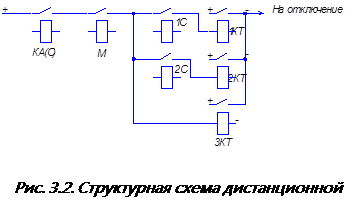 Основные органы защиты и их взаимодействие рассмотрим на примере дистанционной защиты с трехступенчатой характеристикой вида 1 рис. 3.1. в предположении, что на ЛЭП установлена одна из защит 1ДЗ, защиты 2ДЗ и 3ДЗ – отсутствуют. Структурная схема этой защиты для одной фазы показана на рис. 3.2. Пусковой орган КА(KZ) – выполняется посредством реле тока (или минимальных реле сопротивлений). Орган направления мощности KW, предотвращает срабатывание защиты при направлении мощности к шинам.