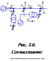 На примере сети, показанной на рис. 3.6, рассмотрим выбор уставок трехступенчатой дистанционной защиты, установленной на подстанции А. Первая зона, дистанционный орган этой зоны не должен срабатывать при КЗ: а) на шинах противоположной подстанции Б (т. К1); б) в месте подключения отпайки, если отпайка включена через выключатель (т. К2); в) за трансформатором отпайки, если отпайка включена без выключателя (т. К3). Перечисленным условиям соответствуют следующие формулы: