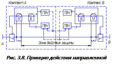 Таким образом, высокочастотная защита состоит из двух комплектов (А и В – рис. 3.8), каждый из которых содержит: релейную часть – та часть которая реагирует на мощность КЗ и ее направление; и высокочастотную часть, генерирующую и принимающую токи высокой частоты. Следует отметить, что в релейную часть, помимо указанных на упрощенной структурной схеме рис. 3.8 органа направления мощности KW и блокирующего реле Б, входит пусковой орган. Пусковой орган защиты, выполняется при помощи двух реле, одно из которых запускает передатчик ГВЧ, а второе реле управляет цепью отключения защиты, то есть его контакты включены последовательно с контактами реле KW, и замыкаются при возникновении повреждения. В качестве таких реле, используются токовые реле, а в случаи недостаточной их чувствительности – реле сопротивления.