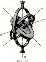 Рассмотрим одну из разновидностей гироскопов — гироскоп на кардановом подвесе (рис.32). Дискообразное тело— гироскоп — закреплено на оси АА, которая может вращаться вокруг перпендикулярной ей горизонтальной оси ВВ, которая, в свою очередь, может поворачиваться вокруг вертикальной оси DD. Все три оси пересекаются в одной точке С, являющейся центром масс гироскопа и остающейся неподвижной, а ось гироскопа может принять любое направление в пространстве, Силами трения в подшипниках всех трех осей и моментом импульса колец пренебрегаем.