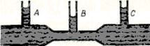 Из уравнения Бернулли (30.7) для горизонтальной трубки тока и уравнения неразрывности (29.1) следует, что при течении жидкости по горизонтальной трубе, имеющей различные сечения, скорость жидкости больше в местах сужения, а статическое давление больше в более широких местах, т. е. там, где скорость меньше. Это можно продемонстрировать, установив вдоль трубы ряд манометров (рис.48). В соответствии с уравнением Бернулли опыт показывает, что в манометрической трубке В, прикрепленной к узкой части трубы, уровень жидкости ниже, чем в манометрических трубках А и С, прикрепленных к широкой части трубы.