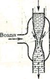 Уменьшение статического давления в точках, где скорость потока больше, положено в основу работы водоструйного насоса (рис.50). Струя воды подается в трубку, открытую в атмосферу, так что давление на выходе из трубки равно атмосферному. В трубке имеется сужение, по которому вода течет с большей скоростью. В этом месте давление меньше атмосферного. Это давление устанавливается и в откачанном сосуде, который связан с трубкой через разрыв, имеющийся в ее узкой части. Воздух увлекается вытекающей с большой скоростью водой из узкого конца. Таким образом можно откачивать воздух из сосуда до давления 100 мм рт. ст. (1 мм рт. ст. =133,32 Па).