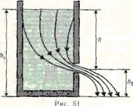 Уравнение Бернулли используется для нахождения скорости истечения жидкости через отверстие в стенке или дне сосуда. Рассмотрим цилиндрический сосуд с жидкостью, в боковой стенке которого на некоторой глубине ниже уровня жидкости имеется маленькое отверстие (рис.51).