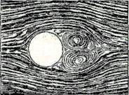Иначе обстоит дело при движении тел в вязкой жидкости (особенно при увеличении скорости обтекания). Вследствие вязкости среды в области, прилегающей к поверхности тела, образуется пограничный слой частиц, движущихся с меньшими скоростями. В результате тормозящего действия этого слоя возникает вращение частиц и движение жидкости в пограничном слое становится вихревым. Если тело не имеет обтекаемой формы (нет плавно утончающейся хвостовой части), то пограничный слой жидкости отрывается от поверхности тела. За телом возникает течение жидкости (газа), направленное противоположно набегающему потоку. Оторвавшийся пограничный слой, следуя за этим течением, образует вихри, вращающиеся в противоположные стороны (рис. 57).