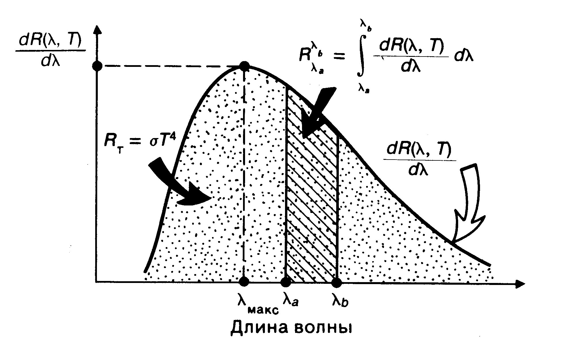 Примечание. Если, например,оценить излучение человеческого тела, температура которого около T = 300 K, то RT составит RT = 500 Вт/м2. При площади кожного покрова около 2 м2 мощность Р, теряемая излучением, выражается величиной Р = 1 кВт. Здесь считается, что кожа излучает как абсолютно черное тело, что для инфракрасной области практически верно. Следует, однако, заметить, что эти потери энергии компенсируются поглощением излучения, поступающего из окружающей среды, в частности от одежды.