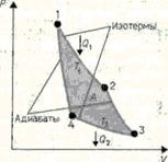 Цикл Карно изображен на рис. 87, где изотермические расширение и сжатие заданы соответственно кривыми 1—2 и 3 — 4,а адиабатические расширение и сжатие — кривыми 2—3 и 4—1. При изотермическом процессе U = const, поэтому, согласно (54.4), количество теплоты