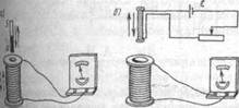Опыт II. Концы одной из катушек, вставленных одна в другую, присоединяются к гальванометру, а через другую катушку пропускается ток. Отклонение стрелки гальванометра наблюдается в моменты включения или выключения тока, в моменты его увеличения или уменьшения или при перемещении катушек друг относительно друга (рис. 179, б). Направления отклонений стрелки гальванометра также противоположны при включении и выключении тока, его увеличении и уменьшении, сближении и удалении катушек.