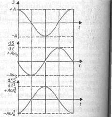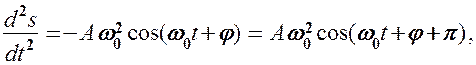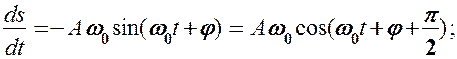 Запишем первую и вторую производные по времени от гармонически колеблющейся величины s (соответственно скорость и ускорение):