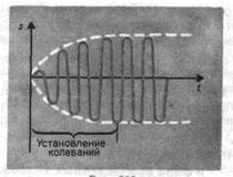 (см. 146.5)) и частного решения (147.11). Слагаемое (147.12) играет существенную роль только в начальной стадии процесса (при установлении колебаний) до тех пор, пока амплитуда вынужденных колебаний не достигнет значения, определяемого равенством (147.8). Графически вынужденные колебания представлены на рис. 209. Следовательно, в установившемся режиме вынужденные колебания происходят с частотой