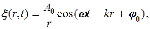 — расстояние от центра волны до рассматриваемой точки среды. В случае сферической волны даже в среде, не поглощающей энергию, амплитуда колебаний не остается постоянной, а убывает с расстоянием по закону 1/