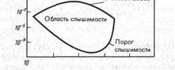 Область, расположенная между этими двумя кривыми, является областью слышимости.