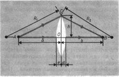 Для вывода формулы тонкой линзы — соотношения, связывающего радиусы кривизны R 1 и R 2 поверхностей линзы с расстояниями а и b от линзы до предмета и его изображения,— воспользуемся принципом Ферма (П. Ферма (1601 —1665) — французский математик и физик), или принципом наименьшего времени: действительный путь распространения света (траектория светового луча) есть путь, для прохождения которого свету требуется минимальное время по сравнению с любым другим мыслимым путем между теми же точками.