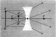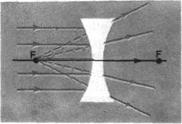 Линзы с положительной оптической силой являются собирающими, с отрицательной — рассеивающими. Плоскости, проходящие через фокусы линзы перпендикулярно ее главной оптической оси, называются фокальными плоскостями. В отличие от собирающей рассеивающая линза имеет мнимые фокусы. В мнимом фокусе сходятся (после преломления) воображаемые продолжения лучей, падающих на рассеивающую линзу параллельно главной оптической оси (рис.235).