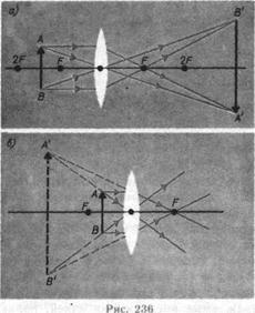 Для примера приведены построения изображений в собирающей (рис. 236) и в рассеивающей (рис. 237) линзах: действительное (рис. 236, а) и мнимое (рис. 236, б) изображения — в собирающей линзе, мнимое — в рассеивающей.