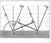 = BC. Положение фронта отраженной волны в этот момент времени в соответствии с принципом Гюйгенса задается плоскостью DC, а направление распространения этой волны — лучом II. Из равенства треугольников ABC и ADC вытекает закон отражения: угол отражения