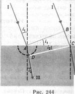 . Положение фронта преломленной волны в этот момент времени в соответствии с принципом Гюйгенса задается плоскостью DC, а направление ее распространения — лучом III. Из рис. 244 следует, что AC = BC /