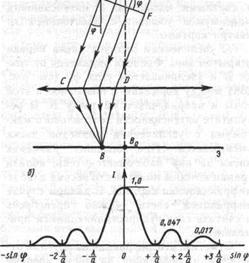 = 0) щель действует как одна зона Френеля, и в этом направлении свет распространяется с наибольшей интенсивностью, т. е. в точке В о наблюдается центральный дифракционный максимум.
