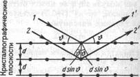 (угол между направлением падающих лучей и кристаллографической плоскостью) и возбуждает атомы кристаллической решетки, которые становятся источниками когерентных вторичных волн 1'и 2', интерферирующих между собой, подобно вторичным волнам, от щелей дифракционной решетки. Максимумы интенсивности (дифракционные максимумы) наблюдаются в тех направлениях, в которых все отраженные атомными плоскостями волны будут находиться в одинаковой фазе. Эти направления удовлетворяют формуле Вульфа — Брэггов