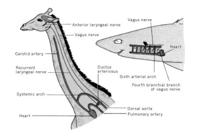 Например, возвратный гортанный нерв у млекопитающих идет от мозга к сердцу, огибает дугу аорты и возвращается к гортани. В результате нерв проходит гораздо более длинный путь, чем необходимо, а аневризма аорты может приводить к параличу левой голосовой связки. Особенно наглядно проблема видна на примере жирафа, у которого длина возвратного нерва может достигать 4 метров, хотя расстояние от мозга до гортани — всего несколько сантиметров. Такое расположение нервов и сосудов млекопитающие унаследовали от рыб, у которых шея отсутствует.
