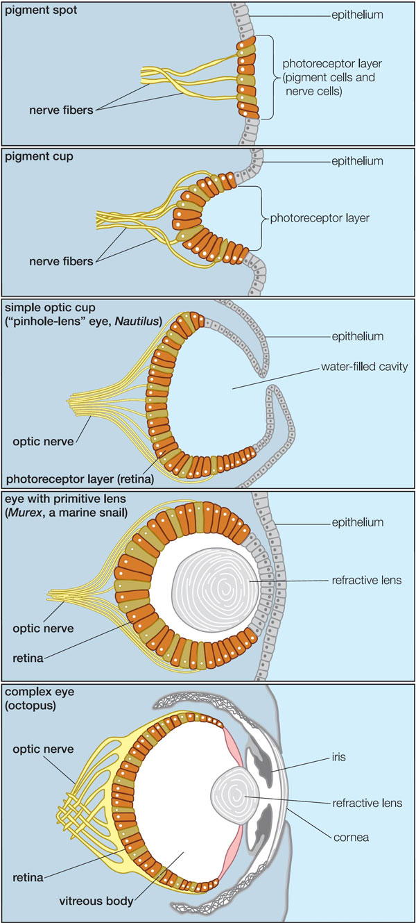 Схема строения глаз современных моллюсков разной степени сложности — от простейшего светочувствительного пятна (у некоторых брюхоногих; вверху) до глаза, сравнимого по сложности и сходного по строению с человеческим (у осьминога; внизу) — наглядно показывает несостоятельность утверждений креационистов, будто такие сложные структуры, как глаза, не могли возникнуть постепенно, а значит, были сотворены такими, каковы они есть. Иллюстрация из книги Science, Evolution, and Creationism // Washington, D.C.: The National Academies Press. (PDF 3,2 Мб можно бесплатно скачать здесь, предварительно зарегистрировавшись).