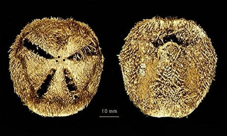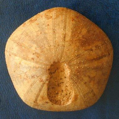 Ископаемый морской еж Pygaster (юрский период) - одна из переходных форм между правильными и неправильными морскими ежами. Преобладает радиальная симметрия, но перипрокт (анальное отверстие) уже сильно смещен назад (на фото - вниз), что придает ежу элементы двустронней симметрии. В индивидуальном развитии современных неправильных морских ежей приобретение двусторонней симметрии тоже начинается со смещения перипрокта из центра верхней поверхности в заднем направлении.