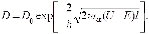 Анализируя это выражение, видим, что коэффициент прозрачности D тем больше (следовательно, тем меньше период полураспада), чем меньший по высоте (U) и ширине (l) барьер находится на пути