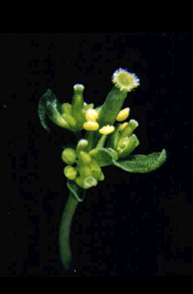 Слева: мутант Arabidopsis по гену AGAMOUS: у него не образуются тычинки и плодолистики, а сам цветок может ветвиться подобно вегетативному побегу (https://chieffa.livejournal.com/54677.html). Справа: мутант Arabidopsis по гену APETALA1: на месте лепестков у него формируются тычинки, чашелистики превращаются в листьях, а в их пазухах развиваются цветы следующего порядка (https://www.ndsu.edu/pubweb/~mcclean/plsc731/flower/flower2.htm).