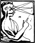 Рис. 2.6, Иллюстрация из «Трактата о человеке» Декарта (1664), в котором изложена его механистическая концепция о функционировании человеческой «машины». Рисунок показывает, как «животные души» стекают по трубкам из мозговой «железы», чтобы обеспечить одновременный поворот обоих глаз и правой руки к предмету В.
