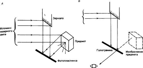 Рис. 5.15. Голография. А. При помощи зеркал часть когерентного лазерного света направляется прямо на фотопластинку, а другая часть - на объект и от нее на ту же фотопластинку. Б. Интерференция между двумя пучками света создает особого рода изображение, которое представляется объемным, когда пластинка освещена первоначальным когерентным лучом. При этом каждый участок пластинки содержит информацию обо всем воспроизводимом объекте.