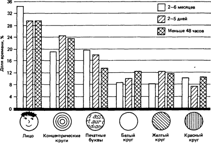Рис 5 20 Когда измеряли время, в течение которого новорожденный смотрит на различные фигуры, цветные или черно-белые, оказалось, что он уже с первых часов жизни отдает предпочтение человеческому лицу.