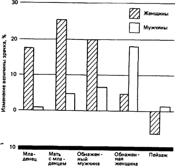 Вид пейзажей не вызывал у испытуемых обоих полов никакой реакции. То же было и с мужчинами, смотрящими на фотографии младенцев, но зрачки большинства из них значительно расширялись при виде фотографий обнаженных женщин. Что касается реакции у женщин, то Хесс отмечал, что она проявляется при виде фотографий матерей с детьми, а также обнаженных мужчин и младенцев (рис. 5.24).