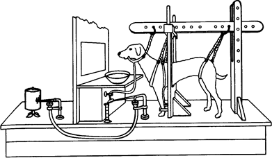 Рис. 7.12. Экспериментальная установка Павлова, с помощью которой он изучал выработку условных рефлексов (классическое обусловливание). Собаку фиксируют в станке, и через разрез в щеке вводят канюлю, с помощью которой можно собирать слюну. Условным сигналом, предшествующим подаче пищи (безусловному раздражителю), служит звонок или зажигание лампочки (на рисунке не показаны). Количество слюны, выделяемой в ответ на этот сигнал, регистрируется кимографом.