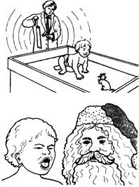 Рис. 7.13. Уотсон выработал у малыша по имени Альберт страх перед крысой, сочетая предъявление этого животного с громким звуком (вверху). Этот «условный страх» в результате генерализации вскоре распространился на все предметы с белым мехом, включая Деда Мороза (внизу).