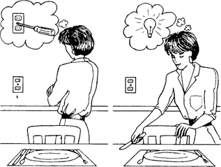 Такая функциональная ригидность проявляется, например, когда нам нужно закрутить винт, а отвертки нет, и нам даже не приходит в голову воспользоваться лежащим на столе ножом (рис. 8.4). Тот же механизм действует, когда приходится иметь дело с изменениями терминологии, единиц измерения или денежной системы. Трудности, которые возникают у многих жителей Северной Америки при переходе от английских мер к метрическим или у французов, когда они рассчитывают цену покупки в «новых франках» (тогда как старых франков не существует, по крайней мере официально, уже более 30 лет), - вот два очевидных примера функциональной ригидности.