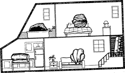 Можно использовать этот прием и для решения более приземленных задач - например, для запоминания уже приведенного выше списка продуктов. Для этого можно, например, мысленно пройти по дому и «разместить» в каждой части дома один из продуктов - хлеб в кухне, цыпленка в гостиной, ветчину в ванной, капусту на кровати в спальне, яйца на лестнице и т.д. (рис. 8.12).