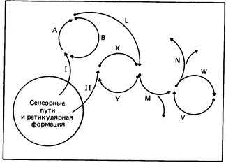 Рис. 8.16. Схема, иллюстрирующая синаптическую теорию памяти. Информация, поступающая от рецепторов, может более или менее прямым путем направляться к центрам, ответственным за немедленное принятие решения, либо передаваться к двигательным центрам по путям A, L, М и N или же X, М и N. Однако одновременно эта информация может циркулировать по кругам, в которых, например, структура А вызывает возбуждение В, а та в свою очередь - опять возбуждение А и т. д. (либо по аналогичному кругу из структур Х или Y). От того, как долго будет сохраняться возбуждение в путях I или II, а также от уровня активации организма зависит, перейдет ли след из кратковременной памяти в долговременную.