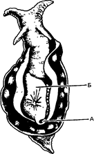Рис. 8.17. Аплизия, или морской заяц. Этот крупный моллюск всасывает воду через сифон (Л), а затем пропускает ее под мантией (Б), где из воды отцеживаются мелкие организмы, которые служат для аплизии пищей.