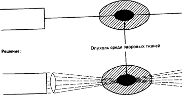 Развитию представлений об «одаренных» личностях и об их способностях к эффективной деятельности способствовали два направления исследований. В 40-х годах немецкий психолог Карл Дункер (Duncker, 1945) выяснил, каким образом его студенты решают определенные задачи. Одна из таких задач состояла в том, чтобы найти способ разрушить у больного опухоль желудка путем достаточно интенсивного облучения, не разрушая при этом окружающие здоровые ткани. Дункер обратил внимание на то, что большая часть студентов не могла при решении этой задачи «оторваться» от уже имеющихся у них знаний1 и предлагала все новые и новые решения «хирургического» типа (вы-вестч участок желудка с опухолью наружу, усыпить больного, использовать свинцовую пластинку и т. п.); все эти варианты, однако, не решали проблему повреждения здоровых тканей. Для того чтобы решить подобную задачу, человек должен обладать способностью устанавливать связи между этой задачей и элементами своего прошлого опыта, на первый взгляд не имеющими с ней ничего общего (например, он мог бы вспомнить, как в детстве поджигал кусочек бумаги с помощью солнечного луча, сфокусированного лупой). Одно из «умных» решений приведенной выше задачи заключалось в том, чтобы сконцентрировать на опухоли лучи слабой интенсивности так, чтобы спереди и сзади от опухоли они были для тканей безвредны (рис. 9.6). Из главы 7 мы уже знаем, как может развиваться мысль, прежде чем прийти к подобному решению -будь то путем инсайта или через рассуждение.