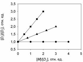 Рис. 1. Метод изохрон. Для определения возраста магматической породы берут несколько ее образцов, различающихся содержанием материнского радионуклида M. Измеряя (например, с помощью масс-спектрометра) концентрации материнского нуклида M, дочернего нуклида D 1, а также нуклида D 2, являющегося нерадиогенным изотопом того же элемента, что и нуклид D 1, строят графики зависимости [ D 1]/[ D 2] от [ M ]/[ D 2]. При отсутствии выноса и привноса нуклидов за пределы породы такой график является прямой линией — изохроной. Изохрона, построенная по точкам с маркерами-кругами соответствует только что извернувшейся породе, с маркерами-треугольниками – породе возрастом в 0,5 периода полураспада радионуклида M, с маркерами-квадратами — породе возрастом в 1 период полураспада радионуклида M.