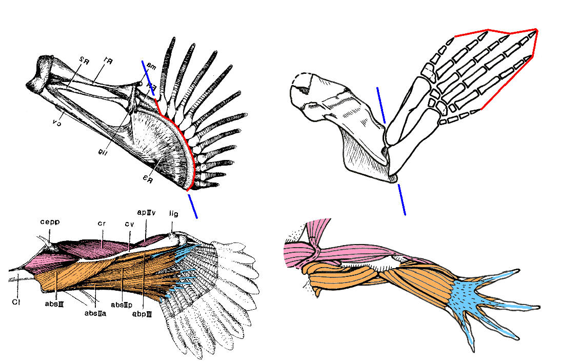 Схема строения передних конечностей мелководного удильщика Antennarius и древней амфибии Tulerpeton. Гомологичные группы мышц показаны одинаковыми цветами. Синей линией показано "главное место сгиба": у тулерпетона это локтевой сустав, а у удильщика - нечто совсем другое, но аналогичное по функции. Изображение предоставил А.Н.Кузнецов.