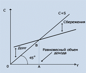 Фактически кривая потребления редко совпадает с биссектрисой и проходит под углом менее 45o. В точке ее пере сечения с биссектрисой доход будет равен потреблению. В той части, где потребление превышает доход, начинается жизнь в долг. Если доход превышает уровень потребления, то разница образует величину сбережения.