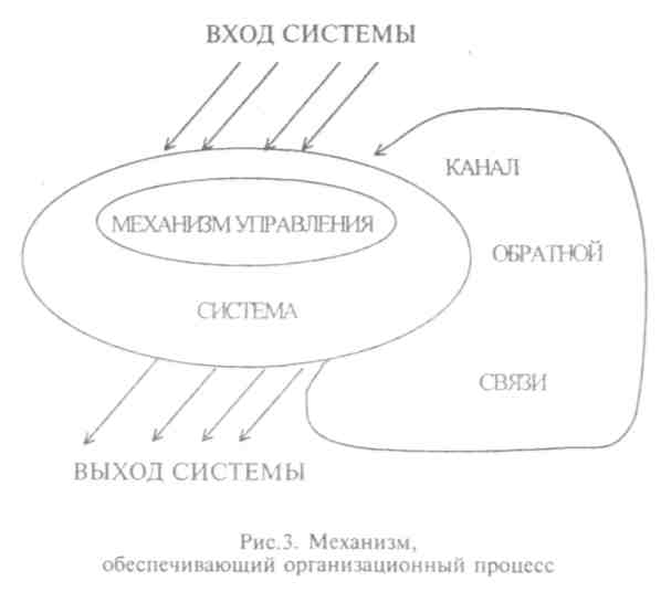 Рассмотрим механизм, обеспечивающий организационный процесс. Пусть имеется некоторая система с направленным на нее внешним воздействием — вход системы. Вместе с вещественно-энергетическим потоком в нее попадает информация, представляющая собой собственную упорядоченность этого потока.