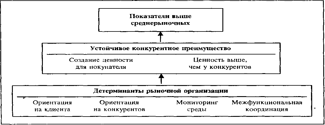 Как показано на рис. 1.4, для того чтобы показатели деятельности организации были выше среднерыночных, она должна достигнуть устойчивого конкурентного преимущества, являющегося результатом постоянного создания превосходной ценности для потребителей. Тремя ключевыми компонентами рыночной ориентации являются, следовательно, ориентация на потребителя, ориентация на конкурентов и межфункциональная координация.