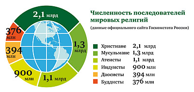 24 Согласно последним данным сейчас в мире проживает 2,1 млрд христиан, 1,3 млрд мусульман, 900 млн индуистов, 394 млн даосистов, 376 млн буддистов и 1,1 млрд атеистов.