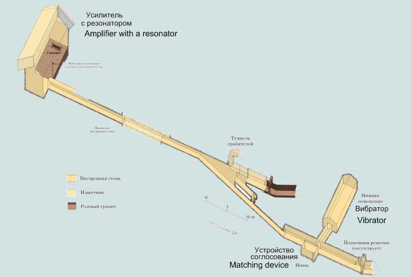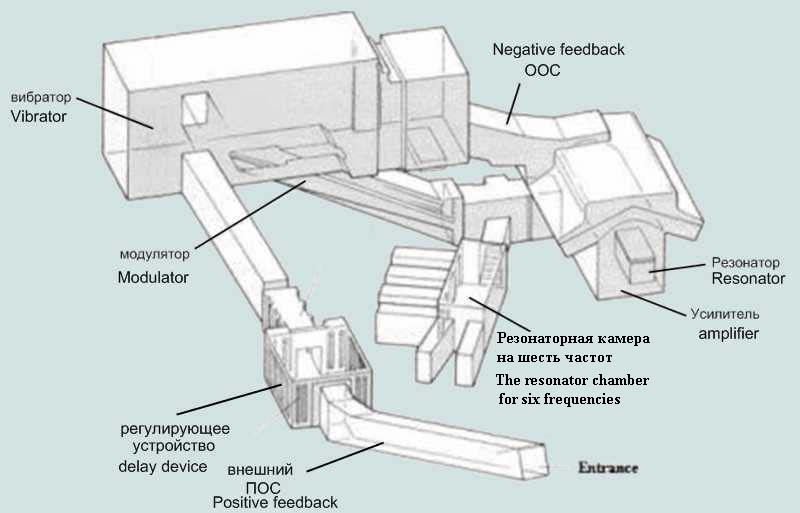 Ну так как же они работали? Первым делом вспомним - они горцы. Вы, придя к каким-нибудь горам, что хотите сделать в первую очередь? Гаркнуть: «Кому не спится в ночь глухую?» Так же и здесь эффект эха. Так же и в пещерах. Инфразвук отражаясь от атмосферы и земли проходит большие расстояния, улавливается ступеньками пирамиды, которая резонирует и передаётся в резонирующую камеру (ухо), а там по волноводу к выходу или к сфинксу (аталанте), который тем самым разговаривает. Более того есть ещё и колебания по земле. Пирамиды Гизы приёмопередатчик и важный узел связи, ретранслятор. Как он передаёт? Если смотреть на разрез пирамиды видим камеру, волновод, видим «саркофаг фараона» вот это-то и есть вибратор: камера с пятью резонирующими мембранами. Человек стоит у входа и орёт туда всяким инструментом (барабаном, трубой), или создает звуковую волну у стен пирамиды музыкальным оркестром. Ещё один важный момент, мембраны и волноводная конструкция должны быть из звонкого гранита, слюды, так звук точнее передаётся. Почему на всех континентах они разные? Наверно в зависимости от рельефа, равнина или джунгли, где много помех, или скорей всего из-за богатства материала. В Египте его мало и они более поздние, люди знали что делали, в Европе были их предшественники, пещерные. Ну а самые первые и опробированные, в центральной америке, где на строительство не жалели материалы, так как общество было жёстким национал-социализмом. Да и конструкция пирамид раскрытая: приёмо-передатчик инфразвука, дешифратор в виде ступенек, волновод с дошифрацией «Дорога мёртвых» и уже сами громкоговорители (малые пирамиды и прочее). Почему в одном районе их много? Ответ: Когда у вас в квартире мобильник плохо работает, Вы что делаете? Правильно, бегаете по квартире в поисках связи как таракан, матерясь. С пирамидой не побегаешь. Либо местная зонная связь, зависит от размера пирамиды.