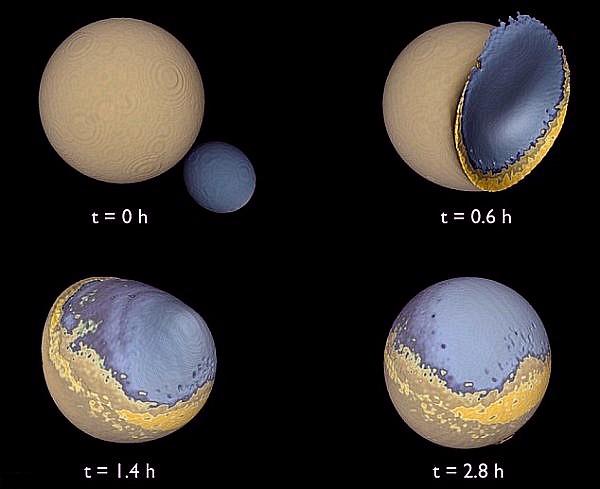 Образовались две планетки, Луна была горячей некоторое время, а Протоземля тёплой, но покрытая льдом с прослойкой воды, что-то вроде спутника Юпитера – Европа, размером с Меркурий или Марс.