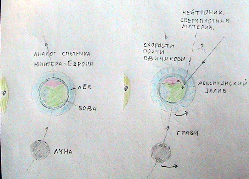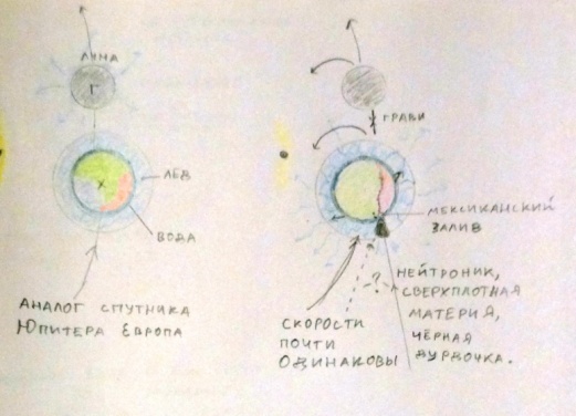 С помощью Google Earth я просмотрел Тихий океан, увидел, что со стороны Азии тихоокеанская платформа выходит из-под неё, в то время как берега Америк подняты горами, а на самом дне идут борозды вытягивания. Ну меня и посетила мысль, а что если Мексиканский залив образовался от падения какого-то крохотного тела, оставив оплавленный след в виде кругляков по краям, отчего и началось расширение. Рядом с кратером, из-за реакции образовались два вулкана, Ниппо и Галаппо, ныне обрушившиеся в бездну, которые стали точками разлома. Но только вот не понятно, как такая кроха смогла вдвое расширить Землю? И тут я вспомнил про брошюрку, купленную ещё в 80х годах мною, учеником, с названием «Нейтронные звёзды». Так вот там писалось, что масса чайной ложки этого суперуплотнённого вещества равна то ли 100 млн. тонн то ли 1 млрд. тонн, ну а дальше вспомнил чёрные дыры, которые даже свет поглощают.