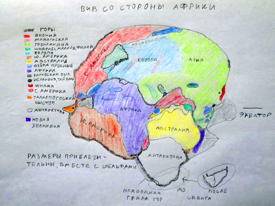 Так как Африка была зажата, Америки первыми начали отплывать, низменности начало топить, образовав Великобританию, Ирландию, Индонезию, поднялись Уральские горы. Одновременно образовалось Красное море, в раскол которого, а так же в Чёрное море, Каспийскую низменность, устремилась вода с затопленных гор, нагорий. Так же волна пошла на Австралию, которая получила хорошего пинка, улепётывая как Шумахер, начала вытягивать платформу из-под Индии, которая вжалась дальше в Азию, подняв ещё выше Гималаи, Тянь-Шань. Интересно, что долина или озеро Такла-Макан была глубокой и чаша не треснула, твёрдое дно. Ну а дальше континенты поплыли, в Антарктиде выросли горы (по краю они были), Евразийская плита полезла на тихоокеанскую, под Африкой началось растягивание Атлантического шва, в следствии чего из-под неё на северо-западе оторвался кусок прибрежной низины пресного Атлантического моря (не путать с океаном). Северная Америка разошлась с Европой. Единственное, Исландия постаралась укрепить мир, не сошла с места, держа атлантический шов (Рейкьявик, миротворец блин). Последним был Байкальский раскол, так как туда не попала солёная вода. Дольше всех плыли Антарктида с Австралией, которая ещё прихватила с собой часть Индокитая, превратив в Индонезию. В программе SASplanet хороший контраст, выставите режим рельеф. С ним можно увидеть, как вода сливалась с гор в Каспий, с Арала в Ледовитый океан. Когда-то в Арктике были низменности с озёрами и в этой прохладной зоне бродили мамонты, единственные кто приспособился к прохладе и высокому притяжению. Наверно это были первые 2 поколения новых динозавров вышедших из тёплых равнин, не успев сильно мутировать.