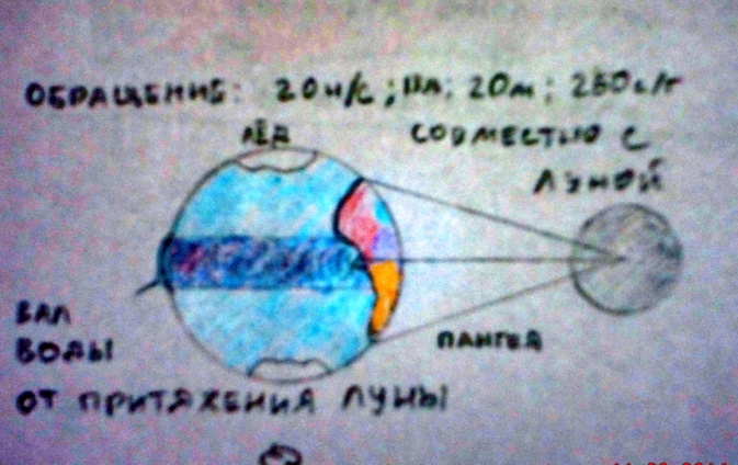Объём Земли стал больше, увеличились гравитационное и магнитное поля, поэтому Луна оказалась в подчинении у Земли, притянувшись ею на сотни км. Одновременно с расширением начался оборот Земли вокруг оси и силы гравитации утянули Луну за собой, сделав не подвижной над Пангеей.
